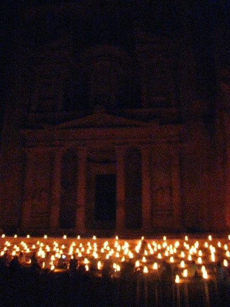 Gegen 12 Uhr mittags heizte die Sonne dann wieder so unbarmherzig auf uns herunter, dass wir den Hotelpool der Hitze vorzogen, um nach einer ausgiebigen Siesta am Abend “Petra by Night” zu genießen. Der Siq sowie der Platz vor dem Khazne al-Firaun wird dabei zwei Mal die Woche mit hunderten von Kerzen ausgeleuchtet. Absoluter Wahnsinn!" Einerseits wegen des fantastischen Anblicks und der Stimmung, andererseits wegen der mühseligen Arbeit all diese Kerzen (und es waren wirklich echte Kerzen) anzuzünden. Neben der “Lightshow” wurde vor dem Schatzhaus auch noch traditionelle Musik gespielt und Tee gereicht.